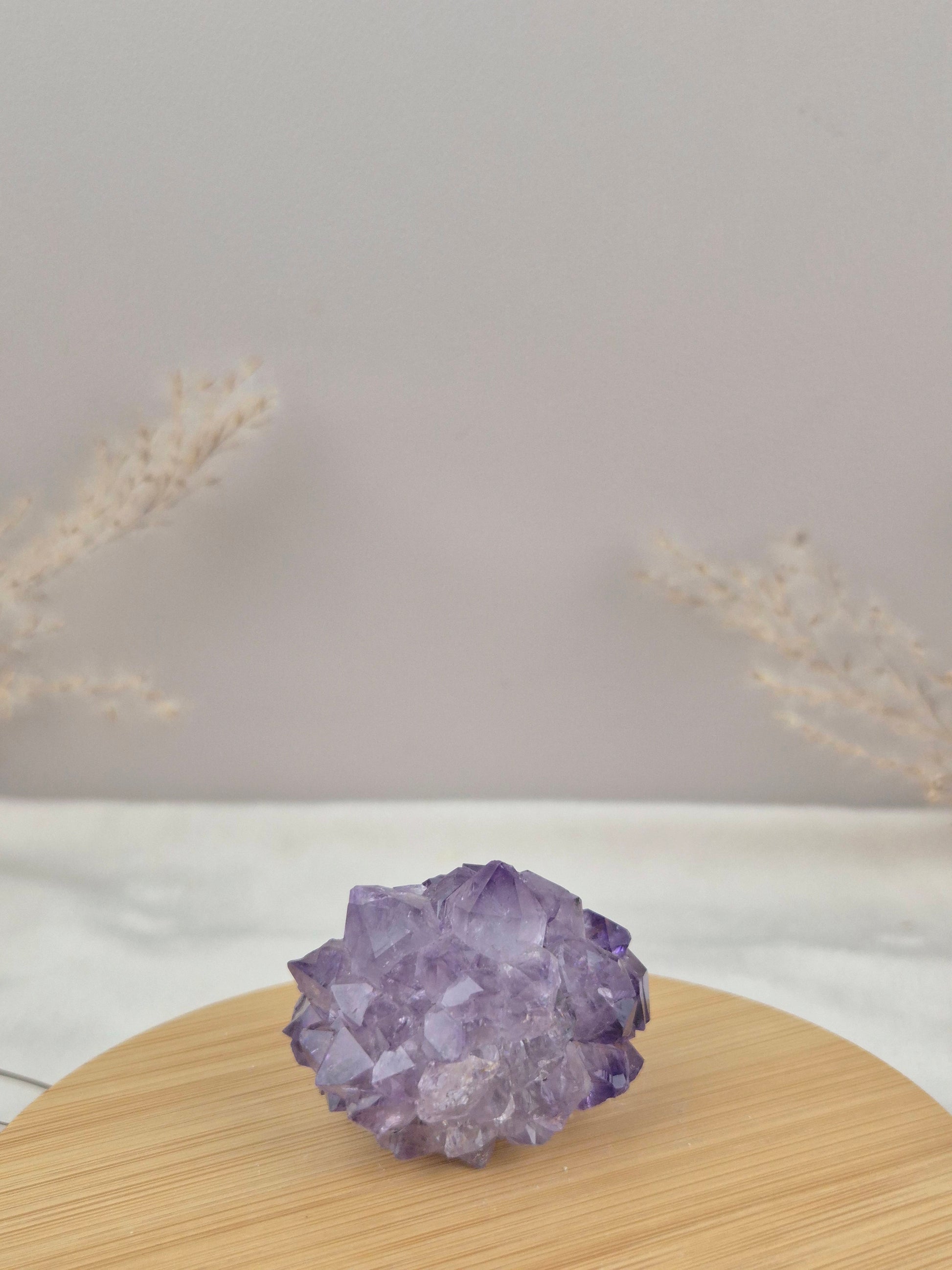 Amethyst zeichnet sich durch seine violetten Farbtöne aus, die von zartem Flieder bis zu tiefem Dunkelviolett reichen können. Die Farbe entsteht durch natürliche Eisenanteile im Quarz und wird oft durch klare Kristallformen und funkelnde Spitzen ergänzt, wodurch jedes Stück zu einem Unikat wird.