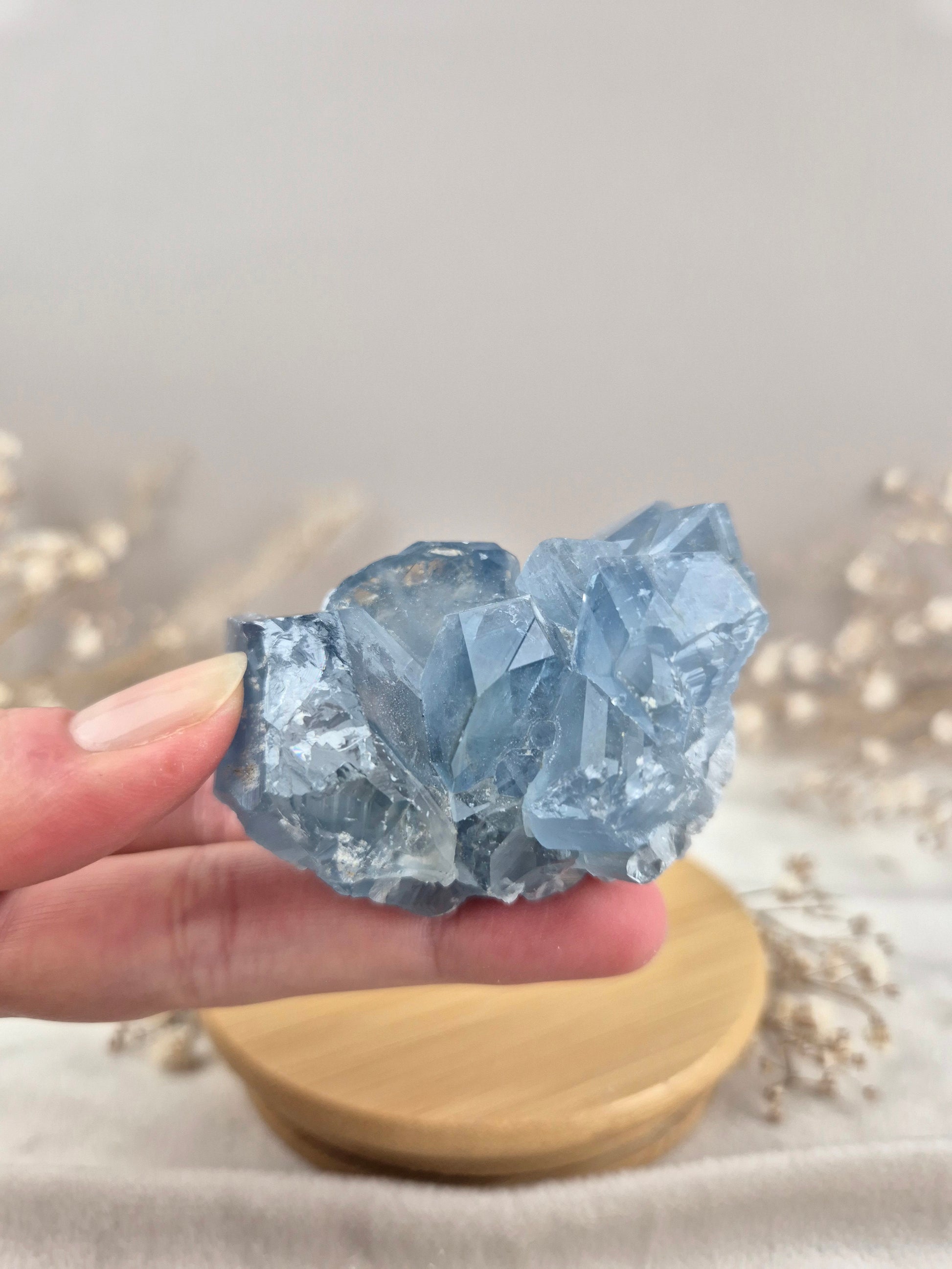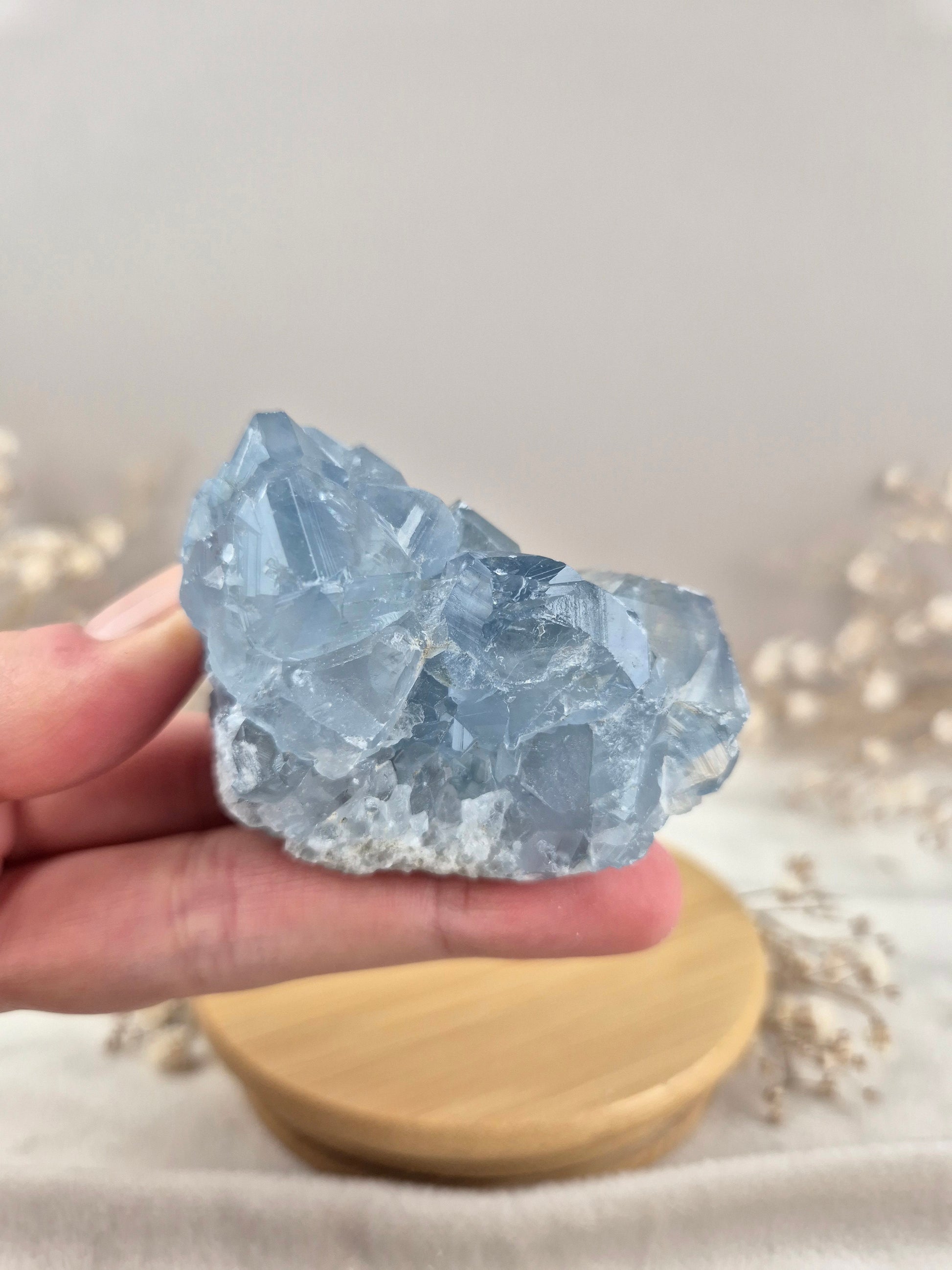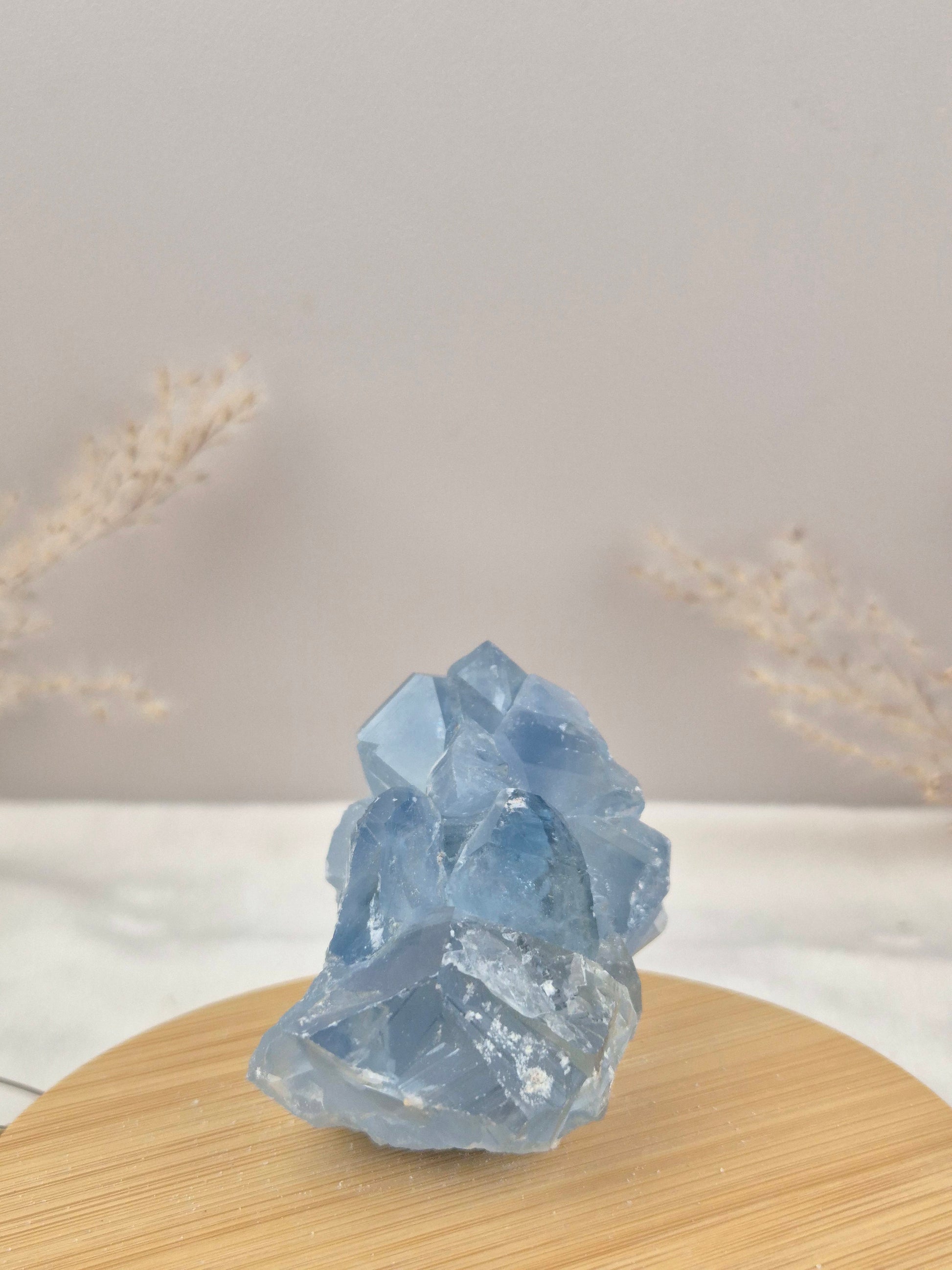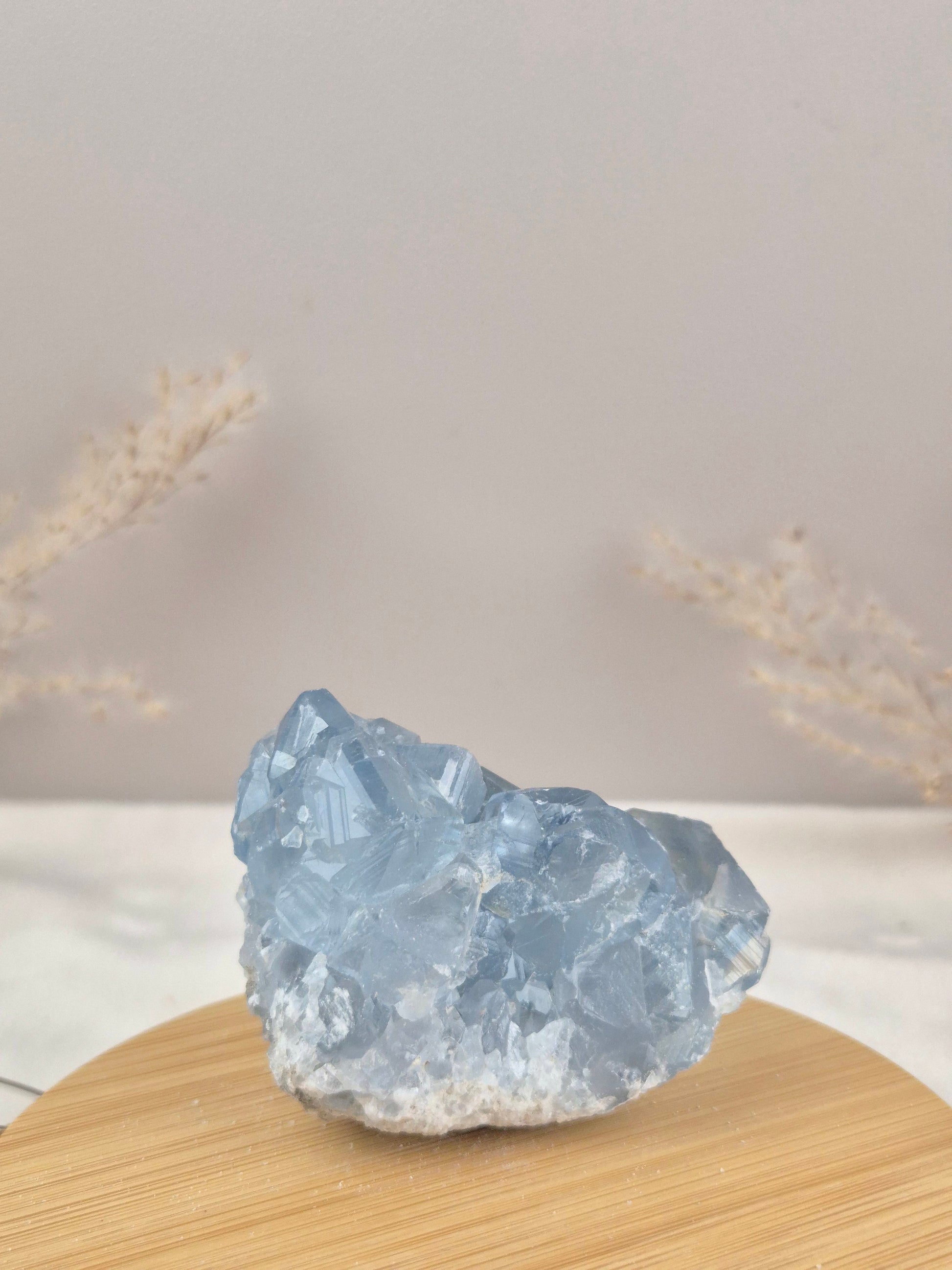 Coelestin begeistert mit seinen sanften bis kräftigeren Blautönen, die von hellem Himmelblau bis zu intensivem Graublau reichen können. Die Kristalle wachsen häufig als kleine, klare Spitzen oder größeren Strukturen, welche jedem Stück eine eigene, unverwechselbare Ausstrahlung verleihen.