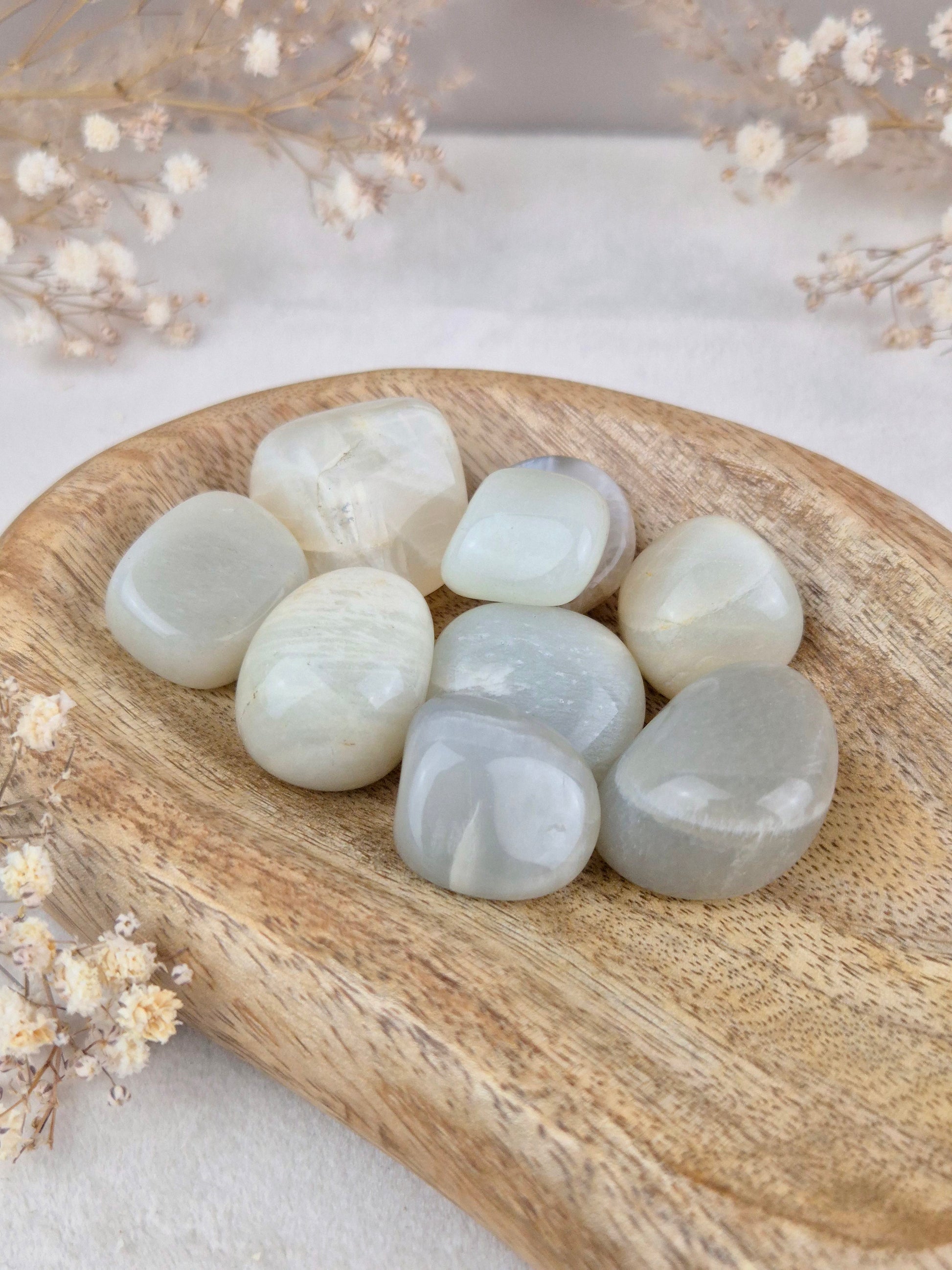 Mondstein zeichnet sich durch seinen typischen silbernen bis leicht bläulichen Schimmer aus, der je nach Lichteinfall sichtbar wird. Grüner Mondstein zeigt ein Farbspektrum von zartem Creme bis zu sanften Pastellgrüntönen.