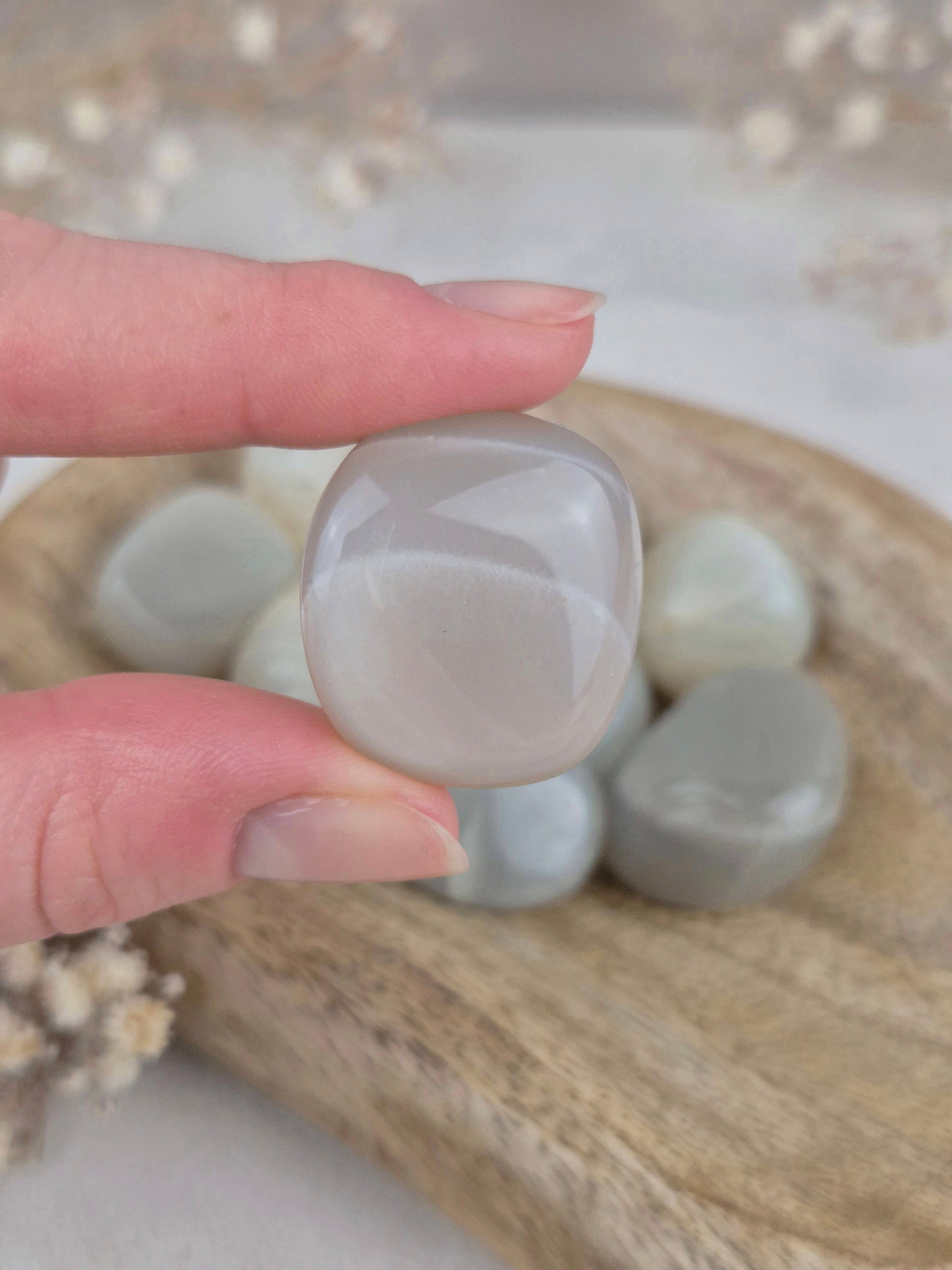 Grüne Mondstein Trommelsteine mit sanften Creme- bis Grünnuancen und silbernem Schimmer ⋆˙⟡ .