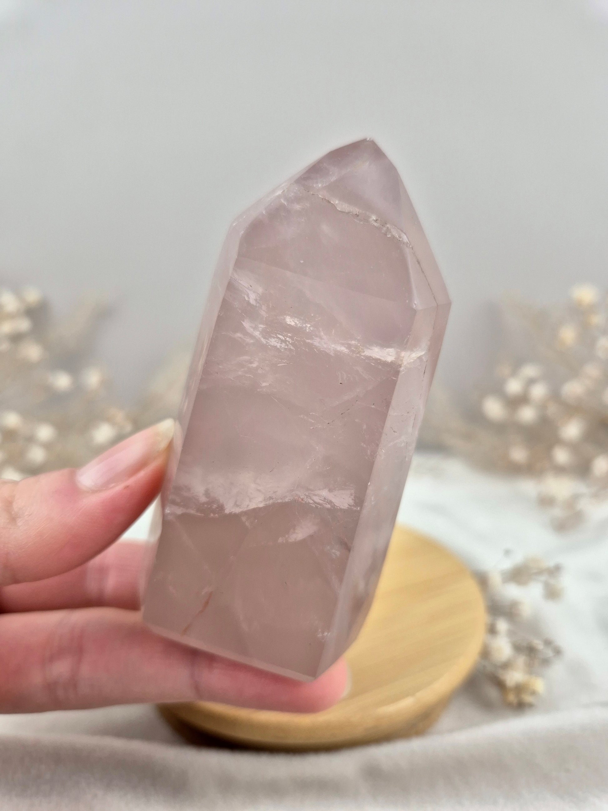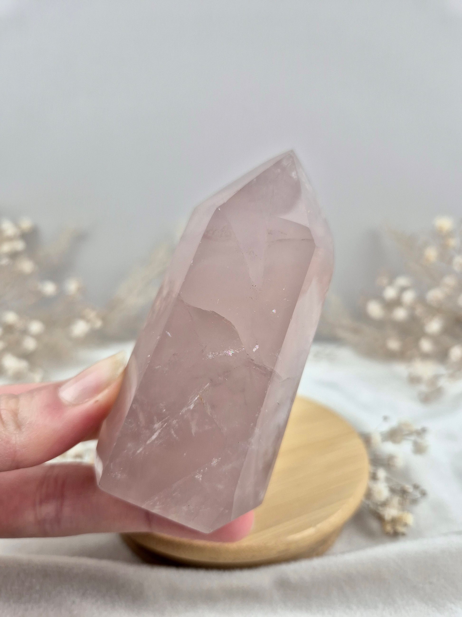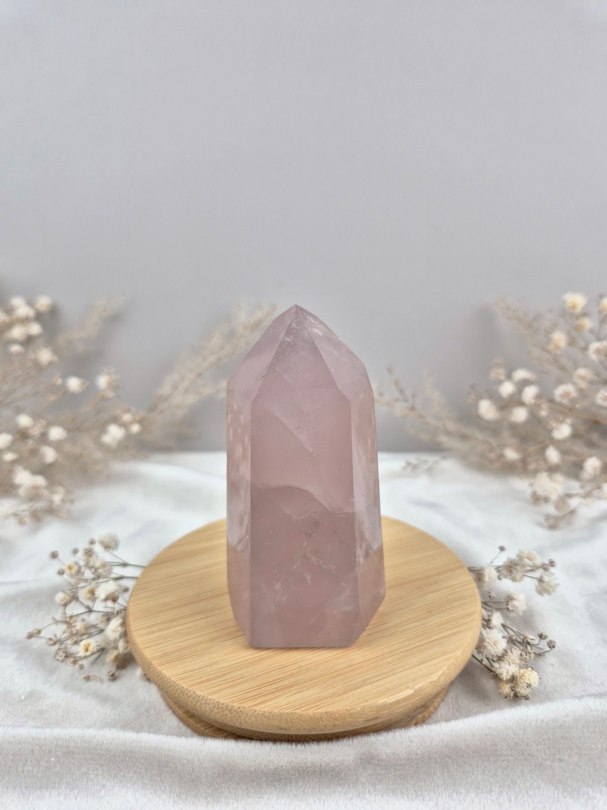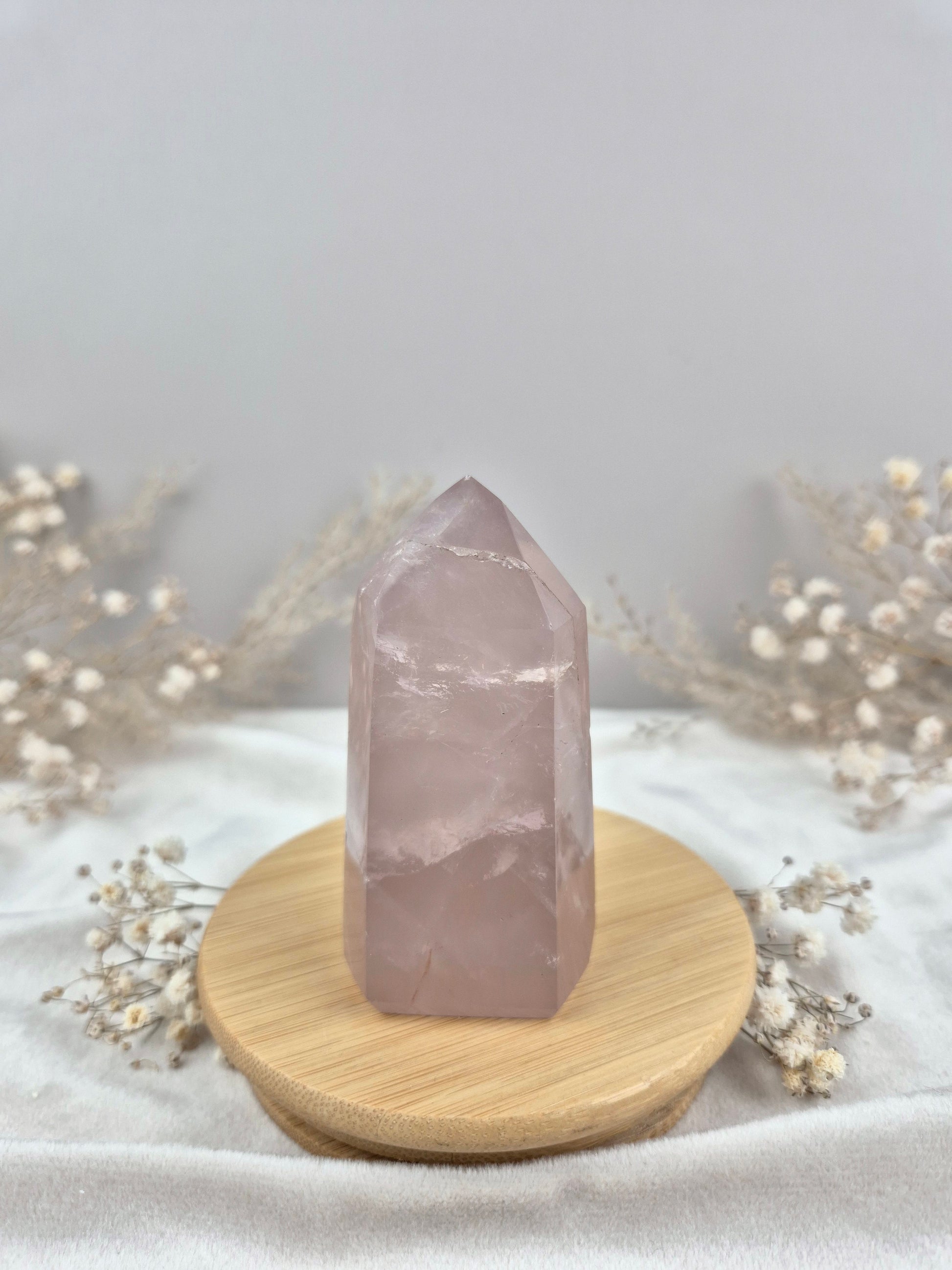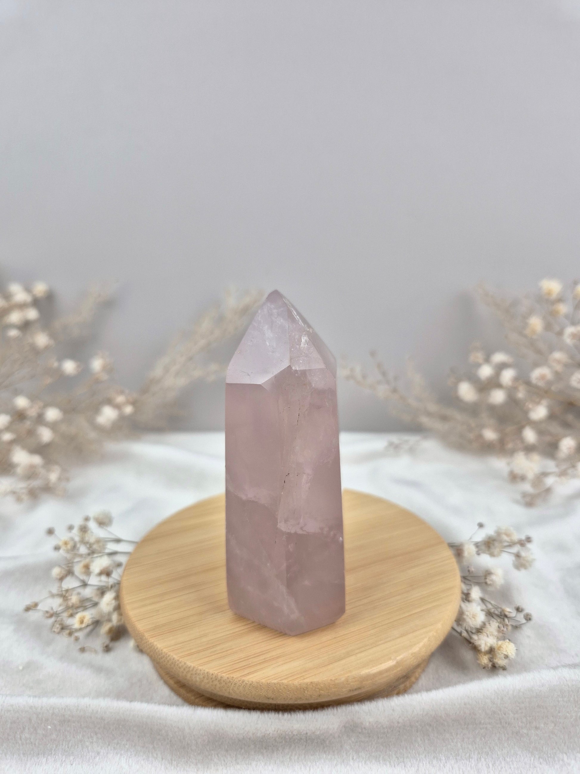 Rosenquarz Turm mit dunkelrosa Farbe und wunderschön silber schimmernder Struktur ⋆˙⟡ .