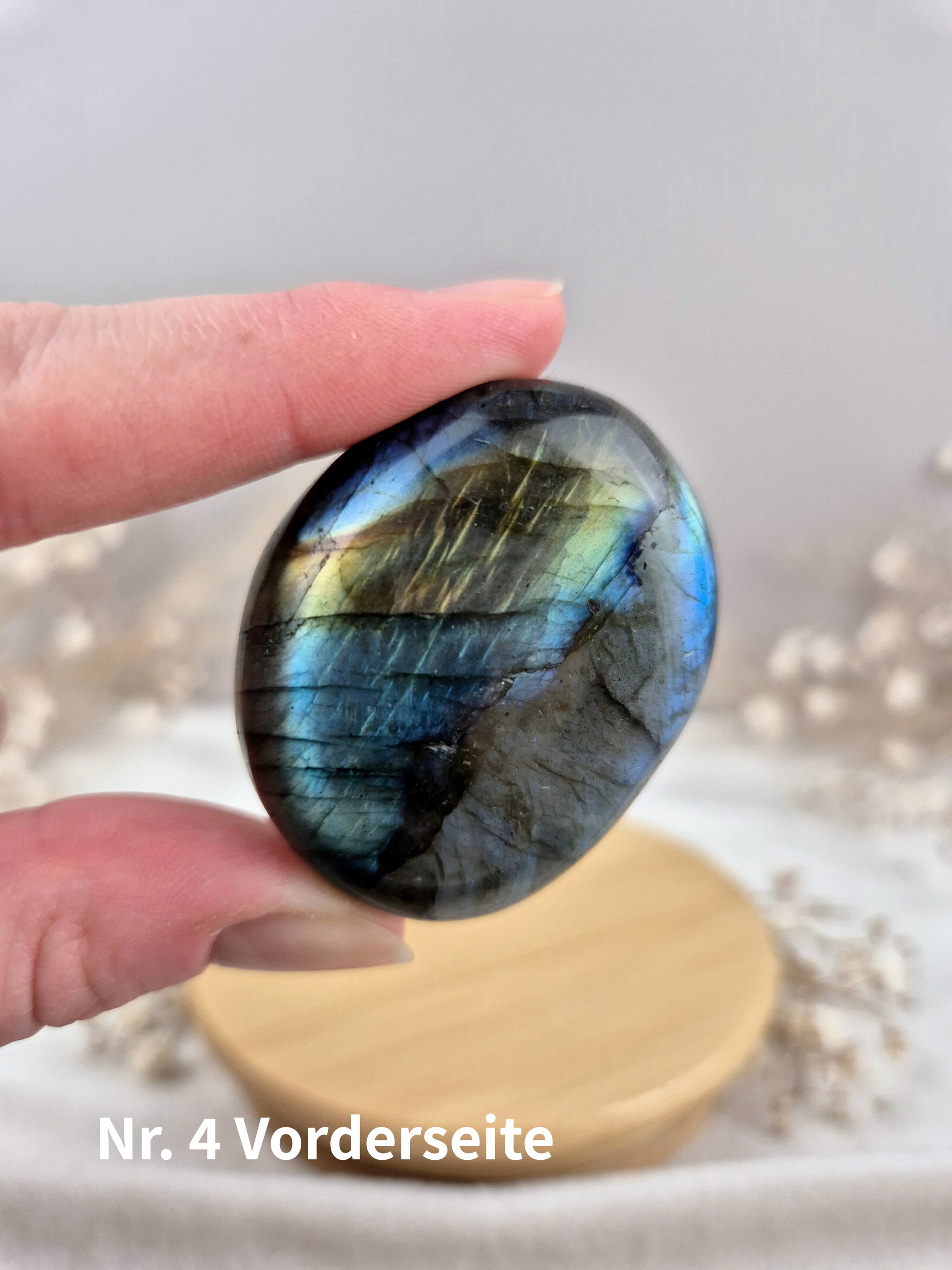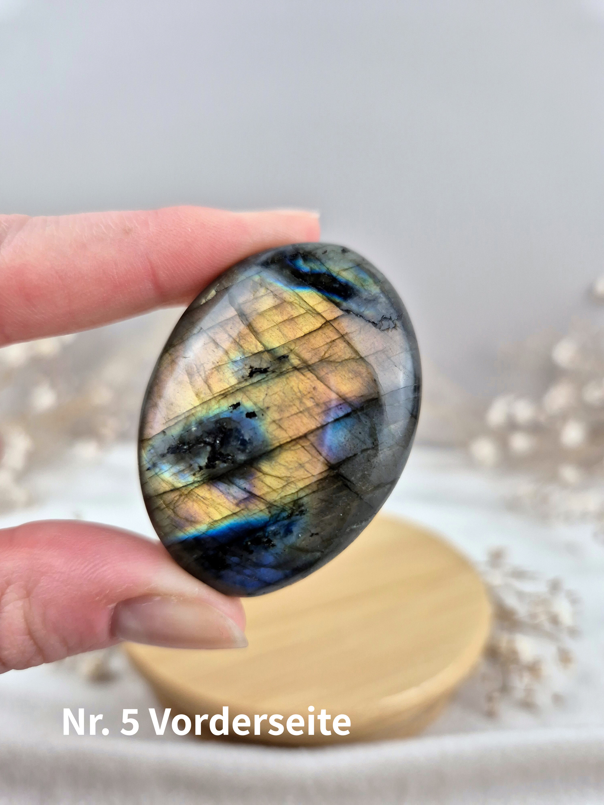 Jeder dieser mittelgroßen Labradorit Trommelsteine bezaubern durch seinen intensiven Flash in verschiedensten Regenbogenfarben und einen zarten silbernen Schimmer!