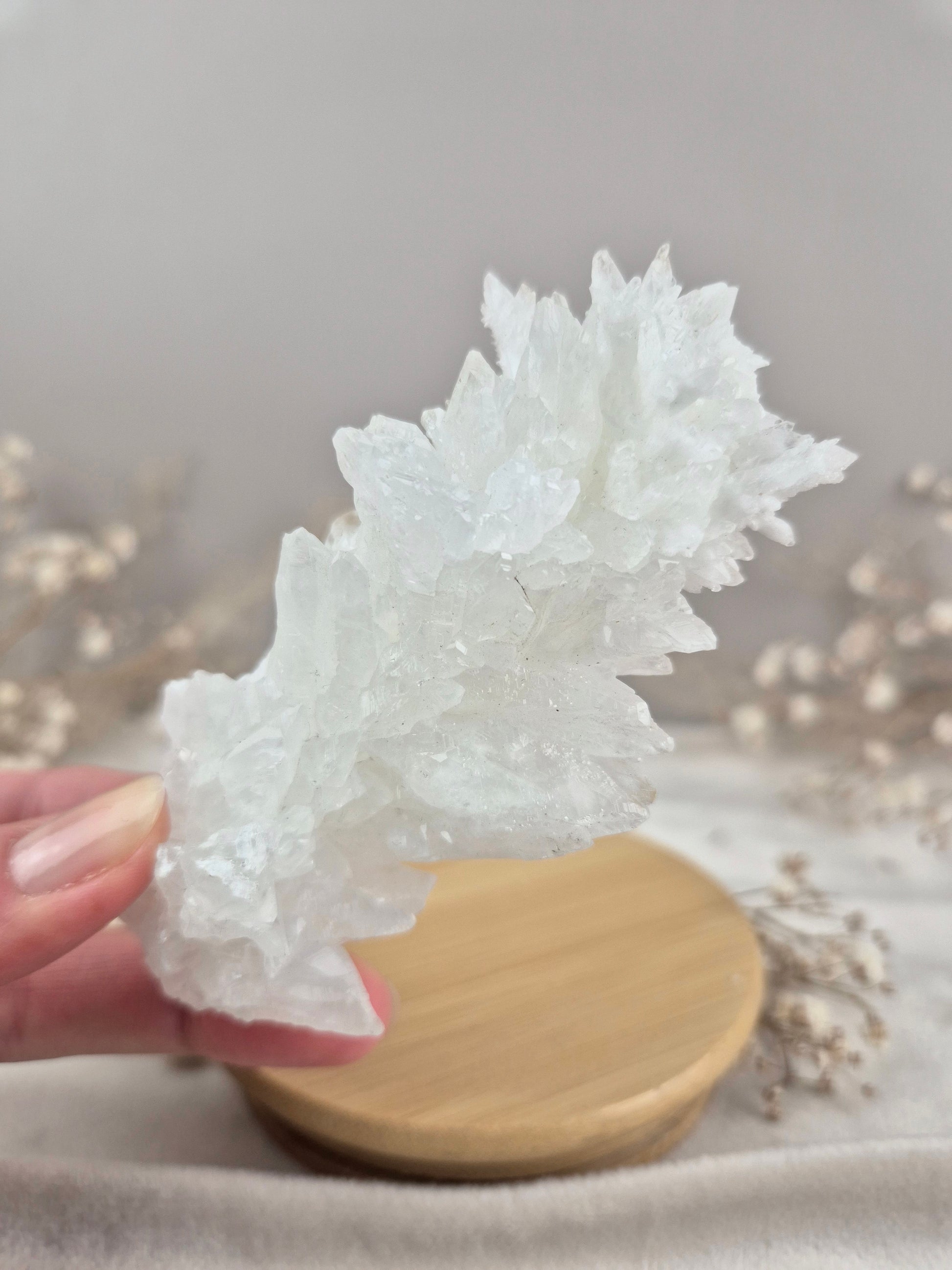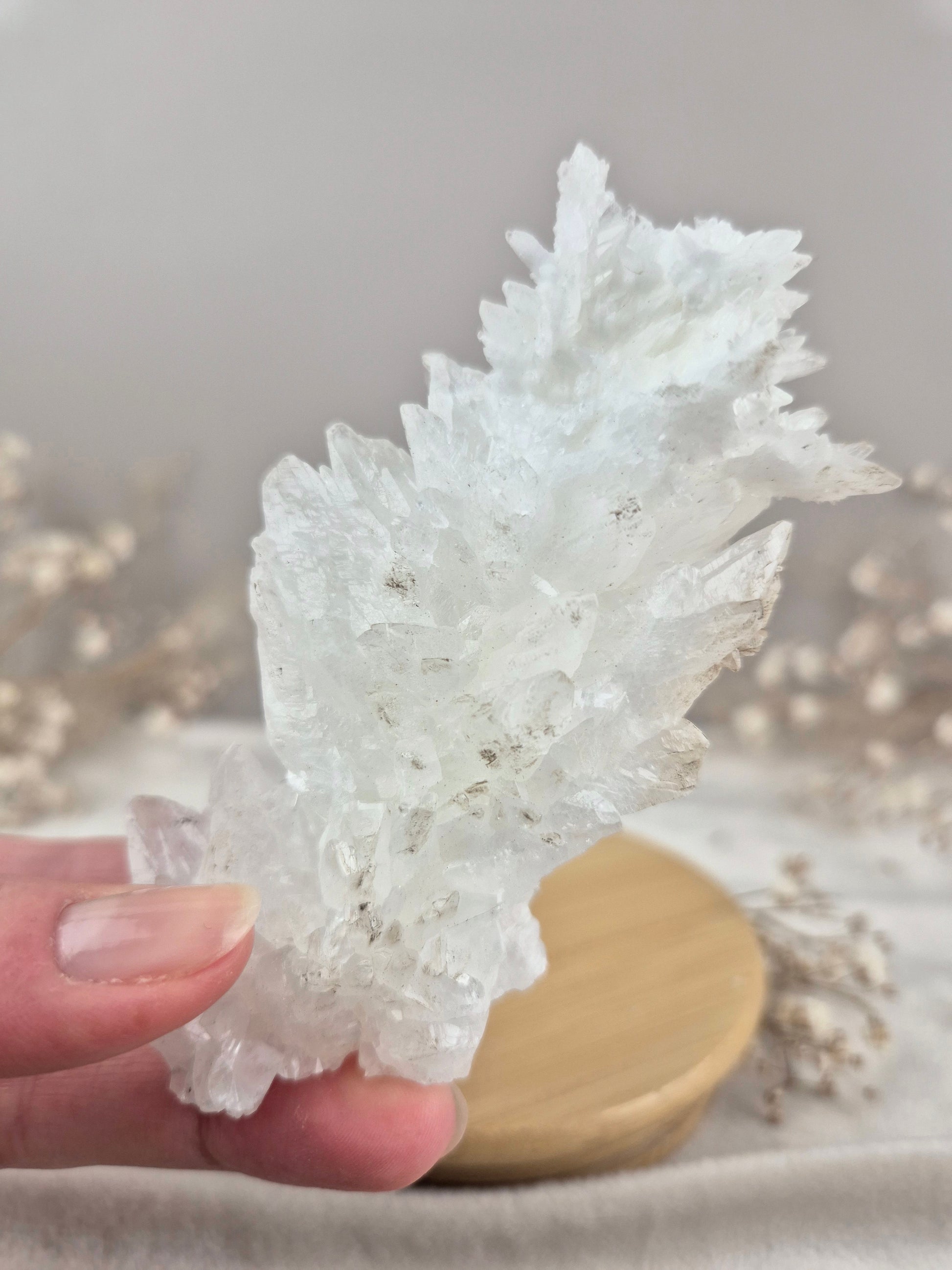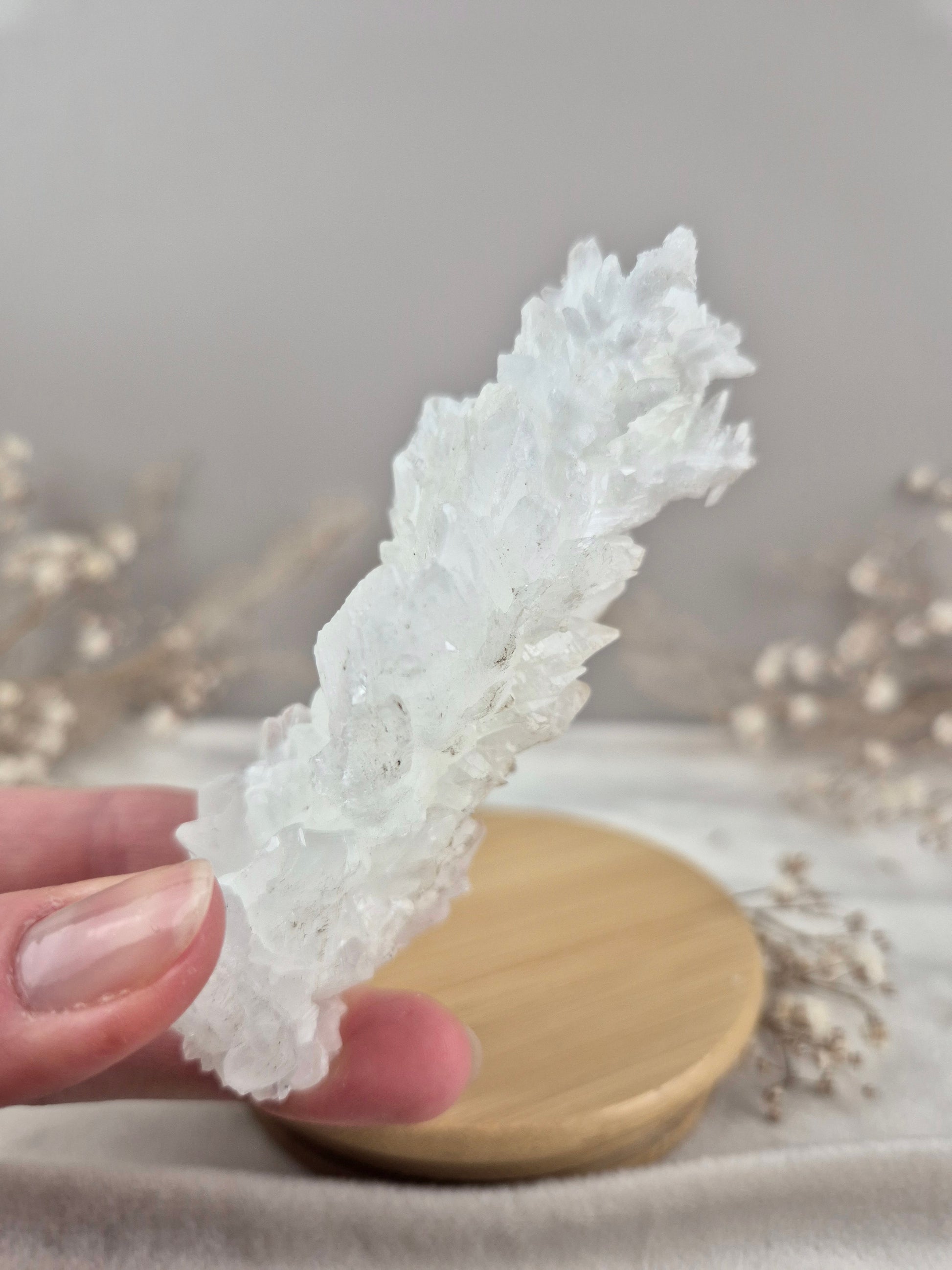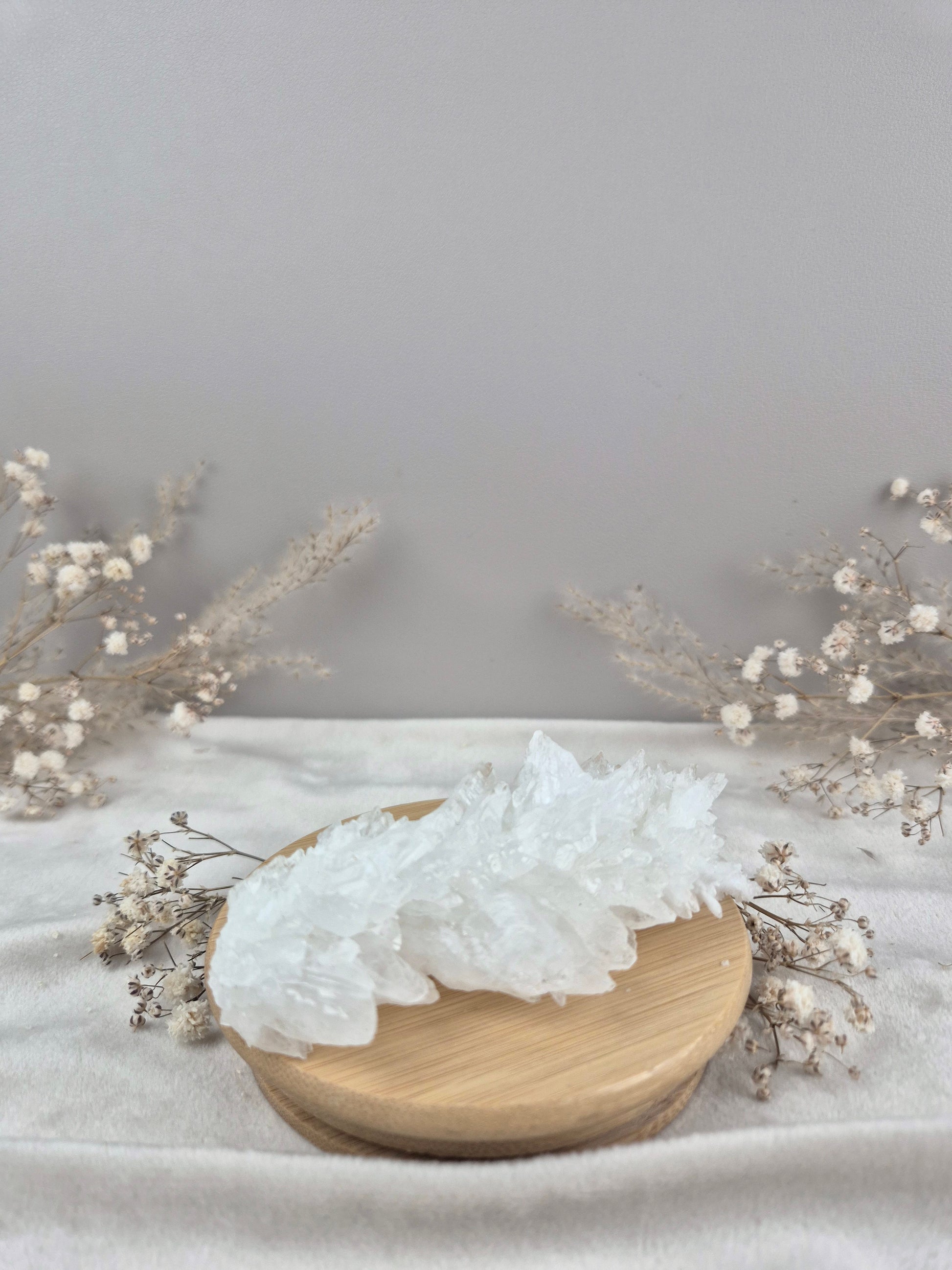 Weißer Aragonit besticht durch seine klaren bis cremeweißen Farbtöne und die charakteristischen nadel- bis fächerförmigen Kristallstrukturen. Die Kristalle wachsen in faszinierenden Anordnungen, die jedem Stück Tiefe und eine lebendige, dreidimensionale Optik verleihen.